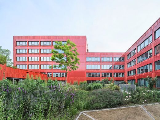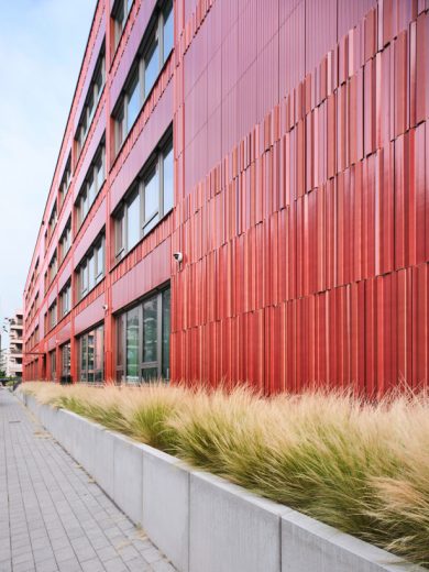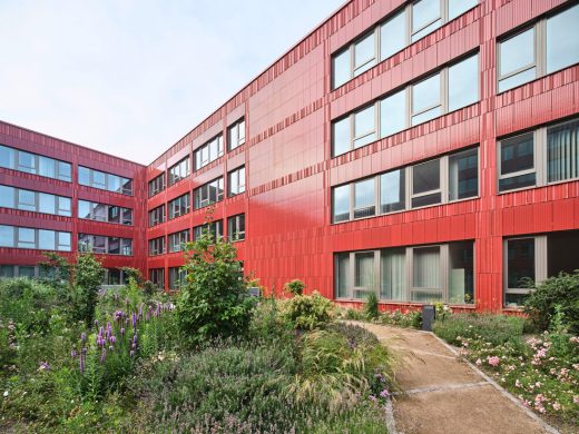 Das Besondere ist die Plastizität der gewählten Ziegelplatten, die seriell und damit wirtschaftlich hergestellt werden, aber trotzdem eine hohe Varianz in der dreidimensionalen Ausformung und einer fein abgestuften Farbgebung aufweisen. Die Grundlage bildet ein an die Nachbarschaft angelehnter Rotton mit Abstufungen in Blaurot, Schwarzbraunrot, Gelbrot.