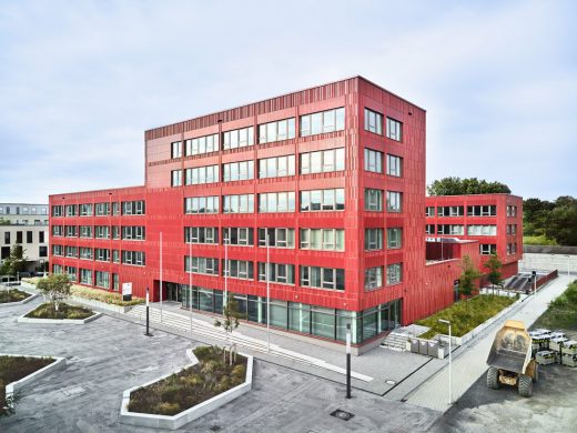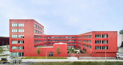 Das neue Gebäude liegt in unmittelbarer Nachbarschaft zum bestehenden Laborgebäude am Quartiersplatz. Dieses besticht durch seinen historischen, industriellen Charme, die feine Wechselwirkung mit unterschiedlichen rot-bräunlichen Farbtönen seines Ziegelmauerwerkes und die horizontale und vertikale Gliederung der Baukörper.