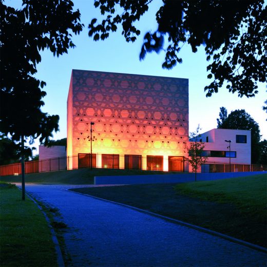 Die alte Bochumer Synagoge wurde in der Reichskristallnacht 1938 zerstört. Nachdem die Stadt Bochum der jüdischen Gemeinde ein Grundstück neben dem Planetarium und oberhalb einer Hauptstraße zur Innenstadt geschenkt hatte, errichteten Schmitz Architekten aus Köln hier nach einem Wettbewerb die neue Synagoge. Eingang, Foyer und Nebengebäude sind in sachlichen, kubischen Formen gestaltet. Die Schaufassade des Baus hingegen erhebt sich weithin sichtbar auf einem leicht erhöhten, mit gestockten Sichtbetonmauern gefassten Plateau über der Straße. Der Würfel der Synagoge tritt dabei in eine graphisch-räumlich-materielle Wechselwirkung mit der gegenüberliegenden flachen Planetariumskuppel, die Karl-Heinz Schwarze 1962 entwarf. Besondere Zeichenhaftigkeit gewinnt die Synagoge durch das ornamentale Relief des Mauerwerks des Kubus, der den eigentlichen Gebetsraum aufnimmt: Die Vormauerschale des Massivbaus besteht aus flach-längsrechteckig gesägten Natursteinen, die abwechselnd vor- und zurückgesetzt sind und durch ihre Anordnung das Motiv des Davidsterns variieren. Die ornamentale Fassadengestaltung wiederum evoziert dreieckige Fensteröffnungen, die im Innern des Synagogenraums einen umlaufenden Fries bilden. Darüber haben die Architekten eine baldachinähnliche goldgelbliche Kuppel eingezogen, die durch eine beleuchtete Fuge von der Wand abgesetzt ist und dem Raum eine erhabene und feierliche Stimmung verleiht: Peter Schmitz’ Bochumer Synagoge ist ein gutes Beispiel für den Qualitätssprung, den der Synagogenbau in der Bundesrepublik in den letzten zehn Jahren erlebt hat.