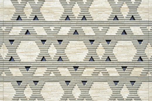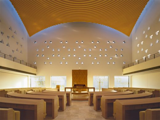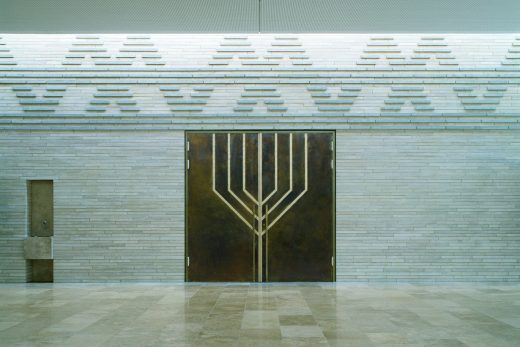 Die ursprünglichsten Formen einer Synagoge – der Tempel in Jerusalem und das Wüstenzelt – bilden in transformierter Form die Grundlage für den Gebetsraum. Ein steinerner Kubus aus hellen, diamantgesägtem Sandstein umschließt den Innenraum.