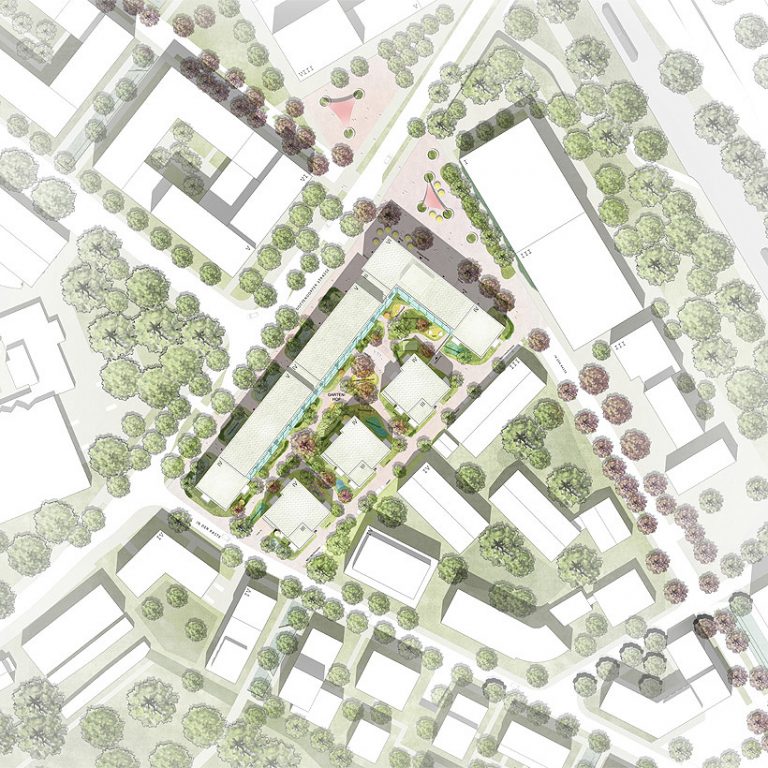 Die Punkthäuser im Quartiersinneren reagieren auf die kleinteiligere Bebauungsstruktur im Südosten und schaffen so einen Übergang zur Nachbarschaft. Durch ihre lockere Anordnung ermöglichen sie eine großzügige Durchgrünung.