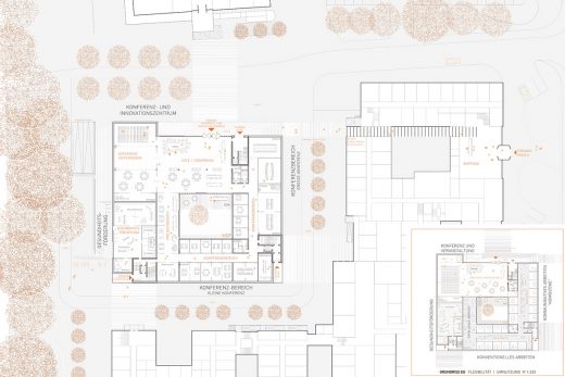 Der Neubau sucht den Dialog zu den umgebenden Bauten und staffelt sich dementsprechend zu diesen ab, sodass eine harmonische Höhendifferenz zwischen Alt und Neu geschaffen wird – nur ein Hochpunkt zur Straße markiert den Eingang in das neu geschaffene Konferenz- und Innovationszentrum, das hierdurch für den Besucher gut sichtbar ist.