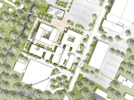 Die Nutzungen und deren Erreichbarkeit sind von außen für Besucher und Mitarbeiter einladend und gut ablesbar gestaltet, ein großer Einschnitt markiert hierbei den Haupteingang zur Konferenzzone, die über einen gedeckten Weg im EG mit dem Empfang in Haus A verbunden ist.
