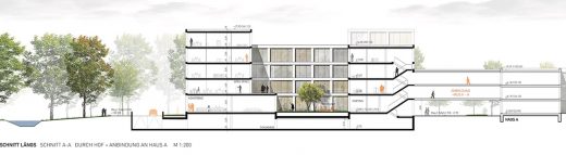 Die geforderten Nutzungen, Räume und die Anzahl an Mitarbeitermodulen wurden erreicht bzw. übertroffen, bei einer gleichzeitig effizienten Kubatur und damit verbundenen geringen Baukosten. Auf eine maximale Ausnutzung des Baurechts wurde zugunsten einer guten Belichtung der Büroräume und einer harmonischen Einbindung in das Ensemble verzichtet. Die Höhenstaffelung des Baukörpers birgt aber Potential für eine zukunftsfähige Erweiterung der Flächen.