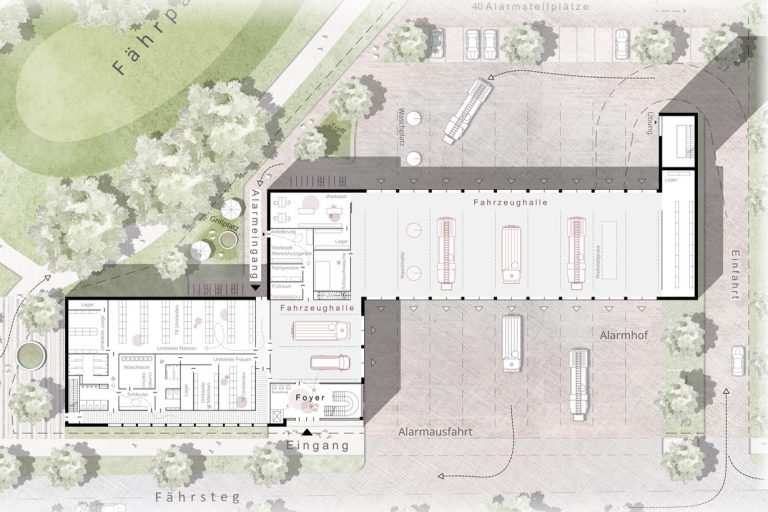 Zentrale Bedingung für ein gutes Feuerwehrhaus sind reibungslose Funktionsabläufe. Neben der architektonischen Ausformung liegt daher der Fokus auf einer klaren Zuordnung der Räume, der Organisation der Fahrwege und der fußläufigen Erschließung. Das Herzstück bildet die Fahrzeughalle mit einem Vorplatz (Alarmausfahrt) zur Straße und neun durchfahrbaren Stellplätzen – davon acht mit einer idealen Schleppkurve, ohne rangieren zu müssen. Hinter dem Hof auf der Rückseite des Gebäudes sind die Alarmstellplätze angeordnet, von denen man über einen kurzen Weg direkt zu den Umkleidekabinen im Haus und den Einsatzfahrzeugen gelangt. Nach dem Einsatz führt ein separates Wegesystem von den Fahrzeugen über einen Schwarzgang und eine Schleuse zu den Umkleiden. Alle geforderten Flächen werden nachgewiesen, darüber hinaus können über der Werkstatt zusätzliche Lagerflächen als Raum-in-Raum Lösung angeboten werden.