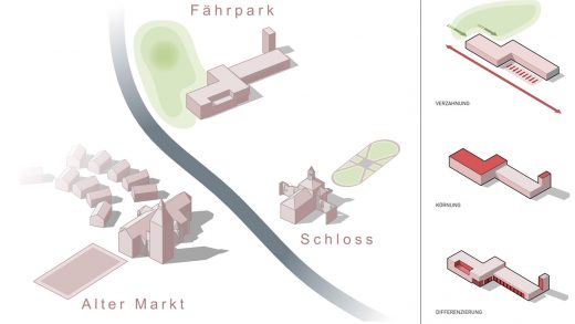 Bezogen auf die benachbarten Altstadthäuser hat die neue Feuerwache ein vergleichsweise großes Gebäudevolumen. Daher besteht der Baukörper aus gegeneinander versetzten Kuben, die auch in der Höhe gestaffelt sind und dadurch eine vielschichtige Gebäudeabwicklung und Silhouette ergeben. Der Charakter des ortstypischen Materials Klinker, der mit seinem Rotton sowohl die Häuser wie Straßen in der Altstadt bestimmt, wird aufgenommen und interpretiert. Es wird eine keramische, hinterlüftete Fassade vorgeschlagen, die eine dauerhafte, wartungsfreie und damit nachhaltige Fassadenkonstruktion darstellt. Zum Schutz vor der Sonne werden die Fassaden auf der Südseite z.T. semitransparent ausgeführt, so sind die Tore der Fahrzeughalle mit perforierten Blechen verkleidet. Durch die Farbgebung fügt sich das Gebäude in die Umgebung ein und das glasierte und profilierte Plattenmaterial verleiht dem neuen Feuerwehrhaus einen soliden und gleichzeitig vielschichtigen Charakter.