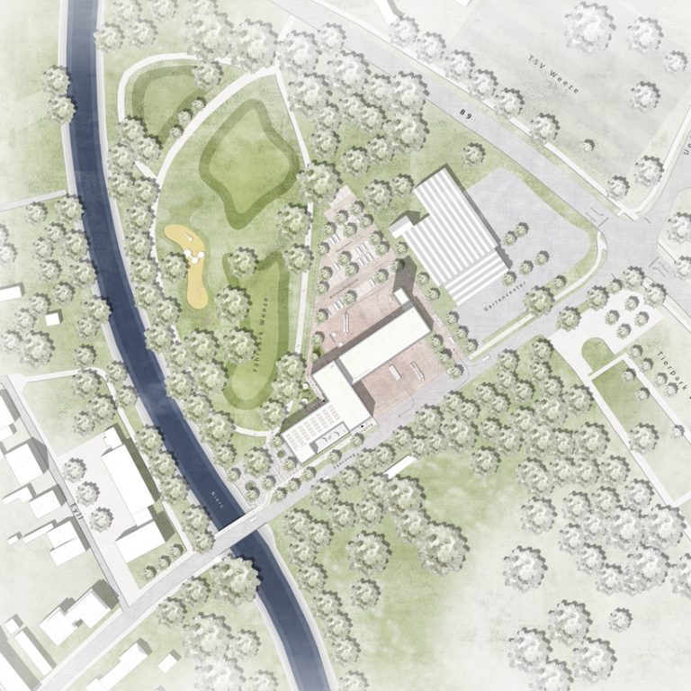 Das Gebäude markiert eine wichtige Schnittstelle im städtebaulichen Kontext. Am Ortseingang in prominenter Lage zeigen sich zuerst die Fahrzeughalle mit den Feuerwehrautos und der Feuerwehrturm. Die gestaffelte Kubatur verengt anschließend den Straßenraum, zu dem sich der Haupteingang mit einem großzügigen Foyer orientiert und den gewünschten öffentlichen Charakter des Feuerwehrhauses stärkt. Für den Bereich zwischen Niers und Feuerwehr wird ein öffentlicher Platz mit eher urbanem Charakter vorgeschlagen, der den Eingang zum Landschaftsraum mit dem Fährpark markiert. In seiner Höhenstaffelung und seiner plastischen Ausformung bezieht sich das neue Feuerwehrhaus auf die Kirche St. Cyriakus in der Altstadt und dem barocken Schloss Hertefeld am Fluss und definiert als öffentliches Gebäude den Stadteingang im Osten von Weeze.