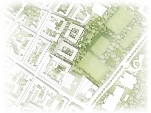 Die Kindertagesstätte liegt im südwestlichen, geschützten Bereich des Plangebietes am bestehenden Parkplatz der Moschee. Somit liegt die Zufahrt / Drop-Off der Einrichtung im ruhigen Hinterhofbereich, abseits des Verkehrs und gewährleistet damit eine fußläufige und autofreie Erreichbarkeit vom ganzen Quartier aus mit optimaler Südausrichtung ins Grüne. Die Lage der Kita nutzt die vorhandenen Erschließungsstrukturen, deren Erreichbarkeit von der Venloer Straße aus verhindert eine unnötige Belastung des Quartiersinneren durch Hol- und Bringverkehr.