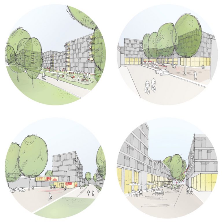 Der Quartiersplatz als urbaner, belebter Mittelpunkt des neuen Quartiers fungiert als Eingangsbereich, mit Besucherstellplätzen und Zufahrt zu den Tiefgaragen, optimal angebunden an das bestehende und neue Fuß- und Radwegenetz.