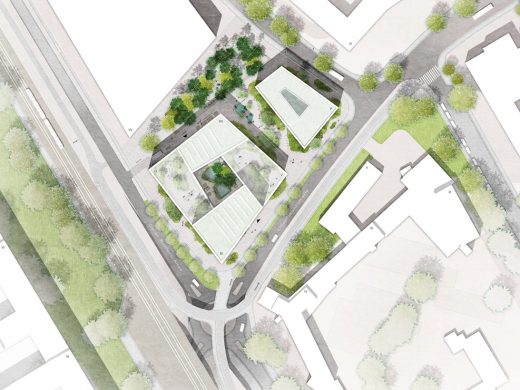 Die Haupteingänge der beiden großen Gebäudekomplexe orientieren sich zu der urbanen Mitte, Gastronomie und Handel im Erdgeschoss sind in allen angrenzenden Gebäuden möglich und stärken den gewünschten öffentlichen Charakter.