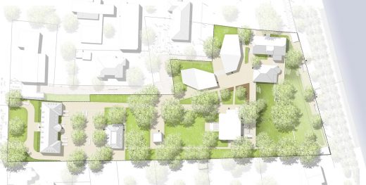Freistehende Gebäude im Park prägen den gesamten Stiftungscampus und die Villen am Rheinufer den näheren Kontext. Die beiden neuen Häuser orientieren sich in ihrer Größe und Körnung an dieser Typologie und bilden mit den benachbarten Villen ein Ensemble mit einer abwechslungsreichen Silhouette. Ein kleiner gemeinsamer Platz mit urbanen Qualitäten öffnet sich über Fugen zwischen den Gebäuden dem baumbestandenen Garten der Villa Prieger, den Stiftungen in den Raiffeisengebäuden und dem großzügigen Freigelände der benachbarten Kinderklinik. Der heutige Niveauunterschied zwischen den einzelnen Villen wird dabei angeglichen, das Niveau um die Neubauten entsprechend angehoben. Der barrierefreie Zugang zu allen Häusern und die gleiche Wertigkeit bestehender wie neuer Gebäude unterstreichen die Idee eines gemeinsamen Campus.