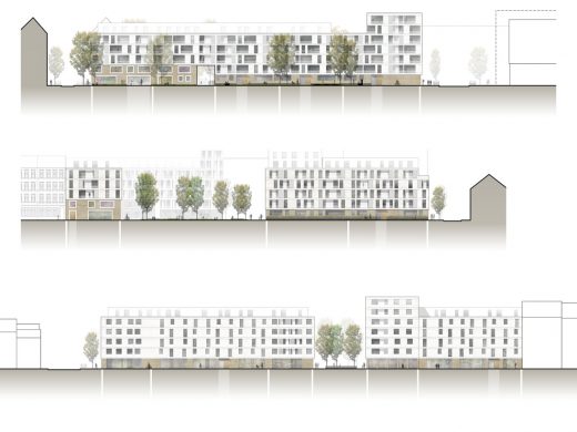 Die öffentlich geförderten und freifinanzierten Wohnungen sind in ihrer Gebäudetypologie gleich und sind gleichmäßig in der Neubebauung verteilt. Eine eingeschossige Tiefgarage bietet ausreichend Platz für Pkw und Fahrräder. Weitere Fahrradstellplätze befinden sich im Erdgeschoss der Studentenhäuser und in den Höfen und Vorbereichen der Gebäude Eine kompakte Gebäudekubatur ermöglicht eine energieeffiziente und wirtschaftliche Bauweise.