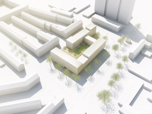 Neben dem sehr urbanen Marktplatz im Nordwesten des Gebietes soll entsprechend der Gebäudeform ein intimerer Freiraum geschaffen werden, der den Nutzungsansprüchen der Hausbewohner und Qualitäten des neuen Quartiers gerecht wird.