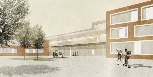 BARBARA-VON-SELL-BERUFSKOLLEG: Der skulptural in den Baukörper hinein geschnittene Haupt-eingang des Erweiterungsbaus orientiert sich zum zentralen Schulhof und zum gegenüberliegenden „unteren“ Zugang in das Bestandsgebäude. Die zentrale Schulhoffläche ist über das Bestandsgebäude, den benachbarten Park und die neu geschaffene Treppen- und Rampenanlage im Nord-Westen des Grundstückes zugänglich. Alle Bereiche des Gebäudes werden wird über eine zentrale Halle übersichtlich erschlossen – diese wird zur lebendigen Mitte der Schule mit vielfältigen Nutzungsmöglichkeiten. Eine breite Treppe mit Sitzstufen verbindet die Geschosse im Foyer und wird zum belebenden und kommunikativen Element. Zwei notwendige Treppenhäuser an den Flurenden ergänzen das Erschließungskonzept.